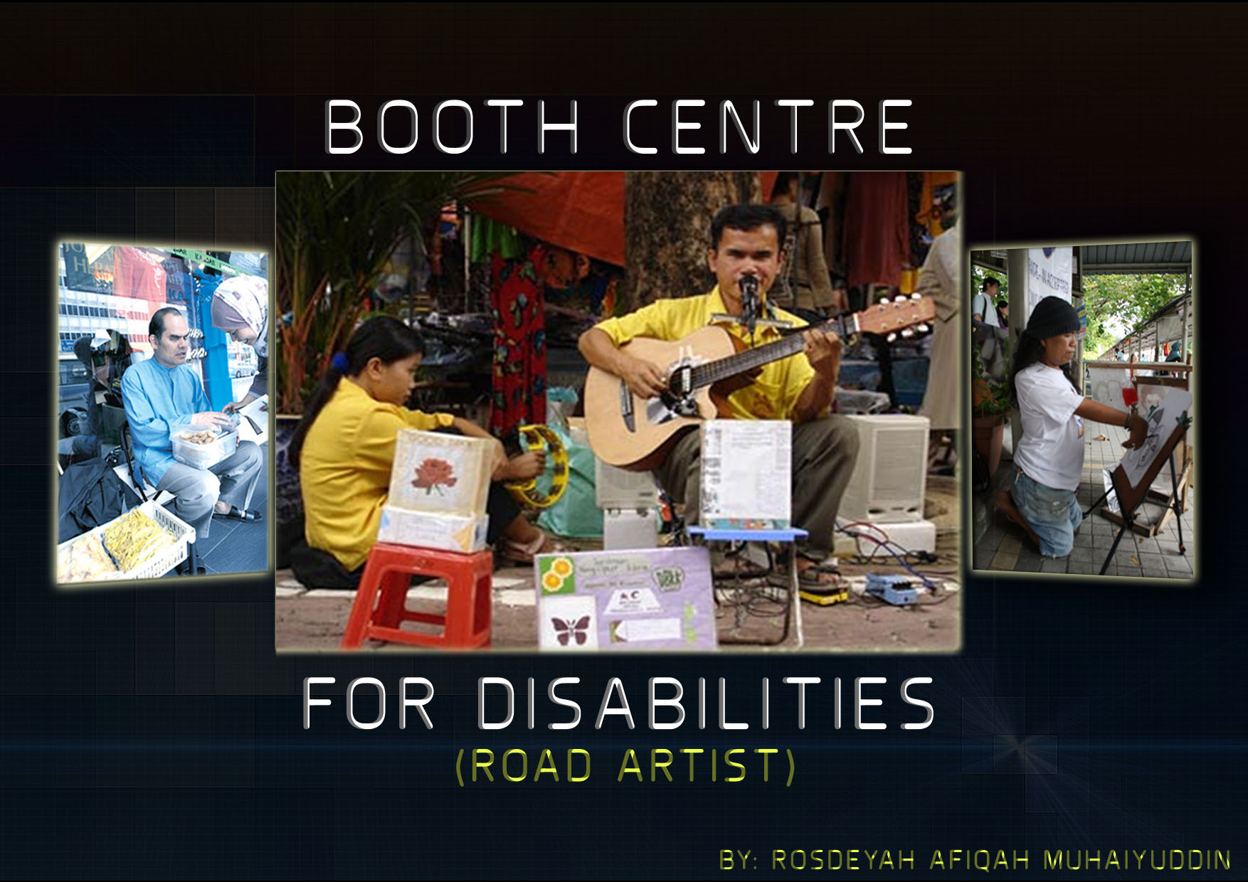 Booth Centre for Road Artist is an aesthetic and sustainable design that suit with the outdoor environment. It have been design for the disabilities people especially the Road Artist with disabilities. This booth is a automatic booth that come with remote control and bag pack to facilitate the disability people to use it.